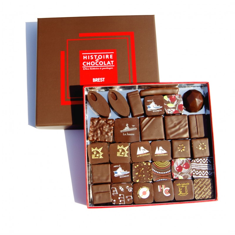 Histoire de Chocolat a sélectionné ses meilleurs chocolats et mis au point un assortiment unique composé de chocolats variés, inédits, savoureux: des ganaches de grandes origines, des spécialités bretonnes comme le Littoral - prestigieux caramel fondant au sel de Guérande habillé de sa cabosse noire, le Diamant Noir au miel d'Ouessant ou les Délices de Beniguet - étonnant craquant sucré salé, épices et sel de Guérande délicatement enrobé de chocolat noir...